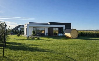 Cały dom ogrzewany jest podłogowo, więc nawet zimą panuje tu przyjemne ciepło. Duże przeszklenia sprawiają, że wnętrze jest jasne i pełne naturalnego światła przez cały dzień.