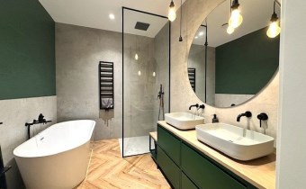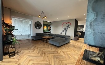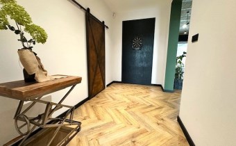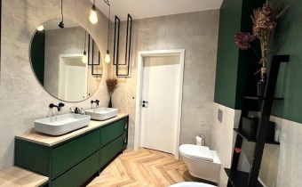 - winylowa podłoga imitująca drewno ułożona w jodełkę i zabudowa stolarska wykonana na zamówienie