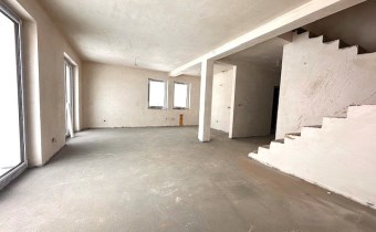 Parter : Przestronny salon z kuchnią ( pow. 38 m²) z wyjściem na taras i do ogrodu, łazienka, wiatrołap, hol, kotłownia/pralnia, garaż