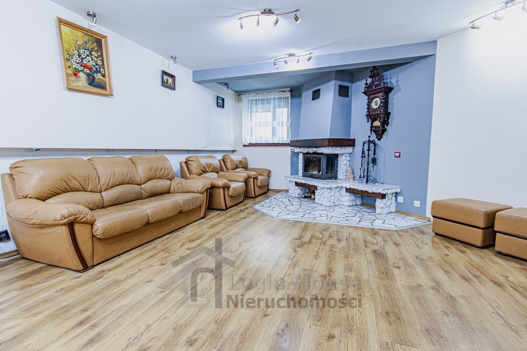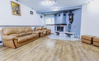 przestronny salon z kominkiem i widokiem na podwórko oraz tereny zielone