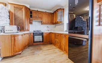 duża, jasna kuchnia z drewnianą zabudową oraz wykończeniem z naturalnego kamienia
